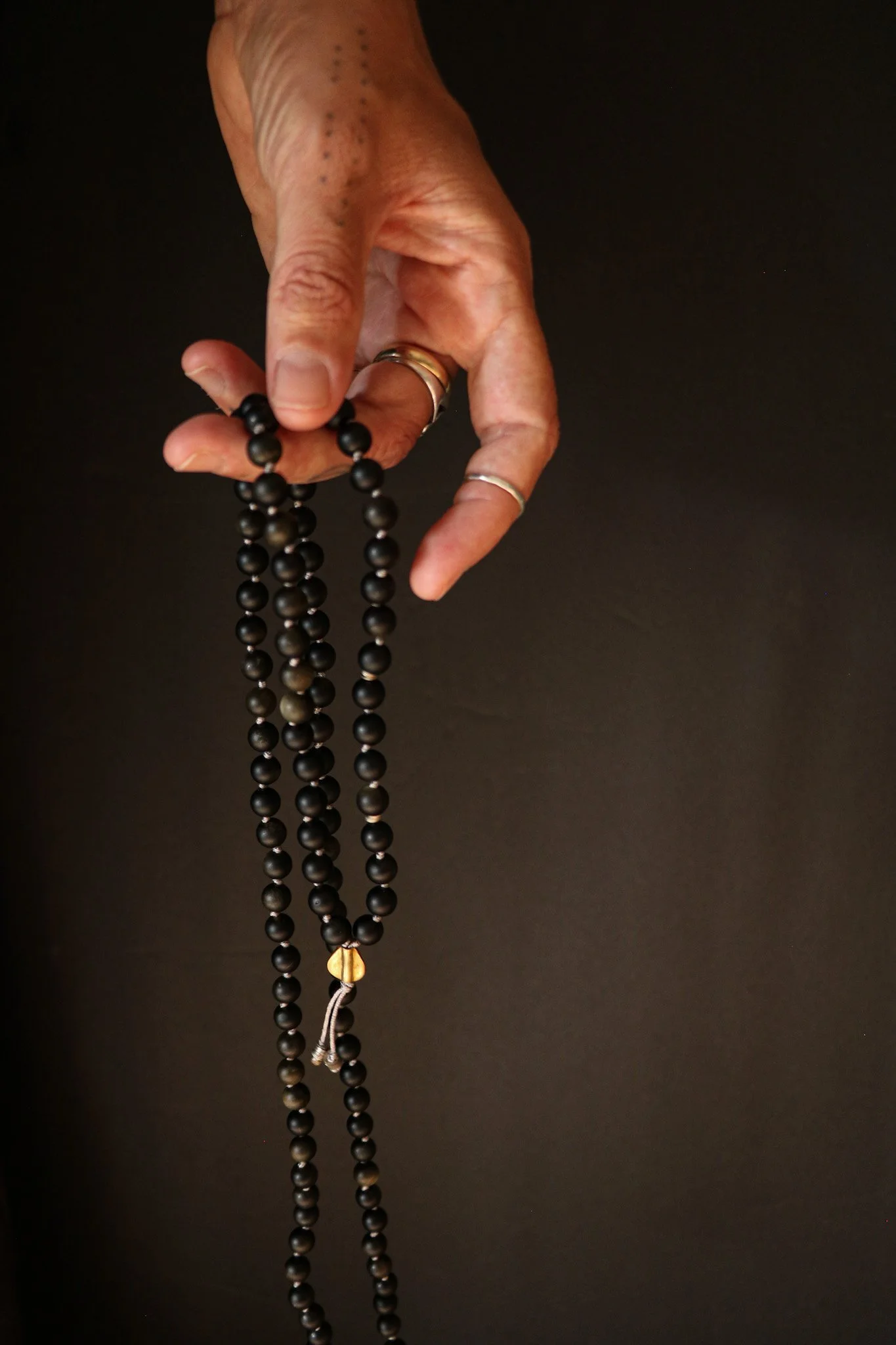 Hand-knotted with Golden Obsidian, this mālā reflects light within darkness, the quiet shimmer of resilience that lives beneath sorrow. Golden obsidian protects and grounds the heart as it softens the edges of pain, helping you see the wisdom that grief reveals over time. Golden Obsidian carries that grounding + shielding qualities of regular black obsidian, but with a layer of golden sheen that symbolizes light emerging from shadow.